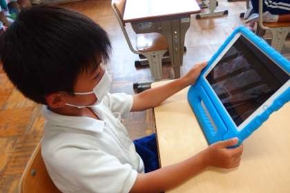 運動会の表現の練習の様子を撮影した動画をタブレットで見て、動きを確認している2年生です。
