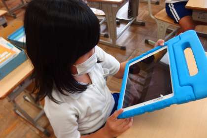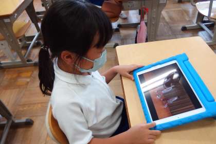 運動会の表現の練習の様子を撮影した動画をタブレットで見て、動きを確認している2年生です。