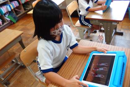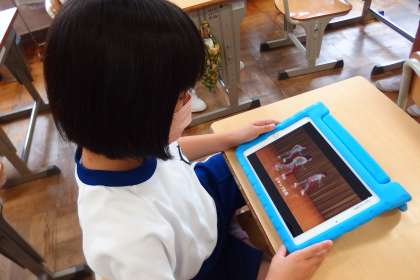 運動会の表現の練習の様子を撮影した動画をタブレットで見て、動きを確認している2年生です。