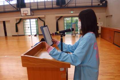 10月6日の東広瀬小学校(42) 公開日 2022/10/08 更新日 2022/10/08 活動の様子 7日の前期後期区切り式で大ひをぅ児童意見発表をする3名が練習をしているところです。 この写真はタブレットで撮影しています。