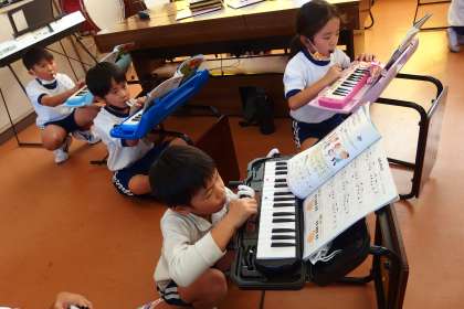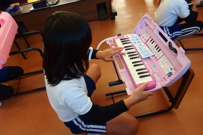 2年生の音楽の授業です。 鍵盤ハーモニカの練習中。 この写真はタブレットで撮影しています。