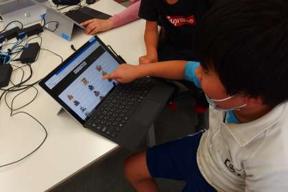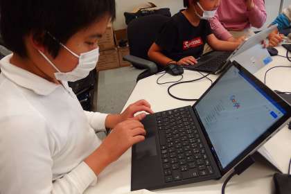 2組の子たちがコンピュータ室のタブレットを使って、ポスターや新聞を作っています。