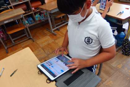 タブレットを使って復習をする5年生です。