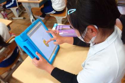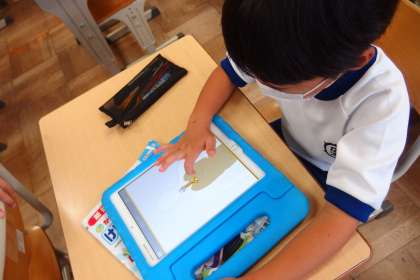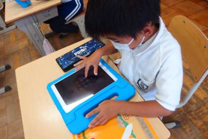 タブレットを使って復習をする2年生です。 この写真はタブレットで撮影しています。