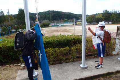 今週の週番の子たちが旗の掲揚をしてくれました。 この写真はタブレットで撮影しています。