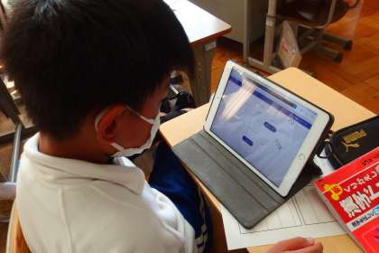 すきま時間にタブレットで復習をする5年生です。