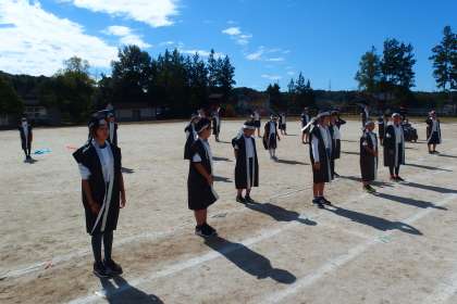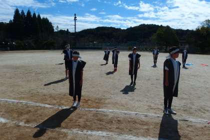 本番の衣装を身に着けて、5年生、6年生が運動会の表現の練習をしているところです。