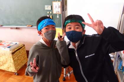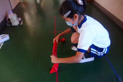 運動会の表現練習に向かう4年生。 バンダナをていねいに身につけ・・・いざ運動場へ。