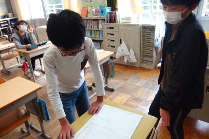 修学旅行で学んだことを新聞にまとめている6年生です。