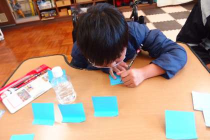 自分のこと、交流学級のこと、支えてくれたまわりの友だちのことなどを書き出し、お互いの考えや思いをシェアしていく学び合いの活動でした。