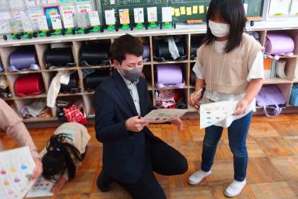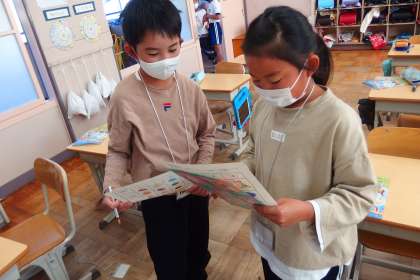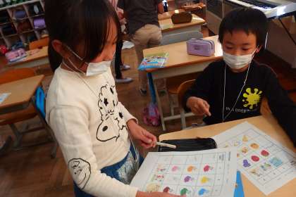 3年生の外国語活動です。 インタビューゲームを行っています。