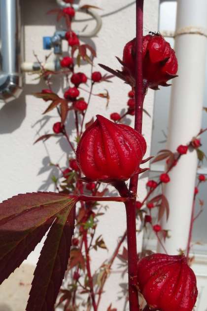 赤い花はローゼルというそうです。 玄関を飾ってくれています。