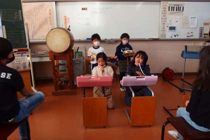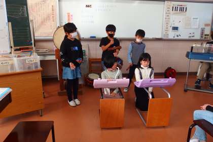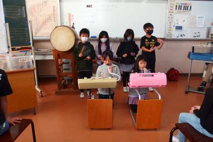 2年生の音楽の授業です。 打楽器と鍵盤ハーモニカで上手に合奏していました。