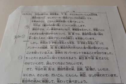 11月第3週を振り返る 公開日 2022/11/20 更新日 2022/11/20 特別活動 アップしていなかった写真をまとめて更新します。 14日(月)の給食献立一口メモを紹介してくれた保健給食委員です。 この日は「豊田ブランドの日」献立でした。 食の献立やレシピ、栄養などの情報は、本校のホームページのトップページの下の方にリンクが貼ってあります。 献立表の中で、豊田市産の食材は太字で表示されています。 スマホやパソコン、タブレットから見られますので、よかったらご覧ください。