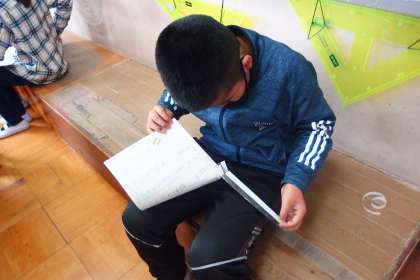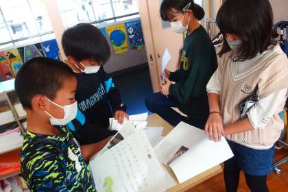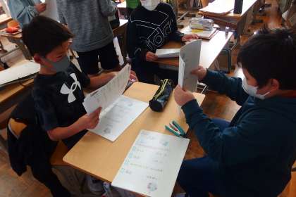 和の文化について紹介するパンフレットを完成させている5年生です。