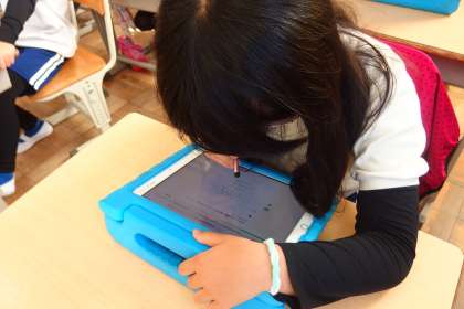 タブレットでデジタルドリル(Qubena)に取り組む2年生です。