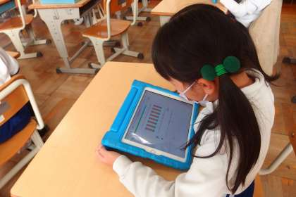 タブレットでデジタルドリル(Qubena)に取り組む2年生です。