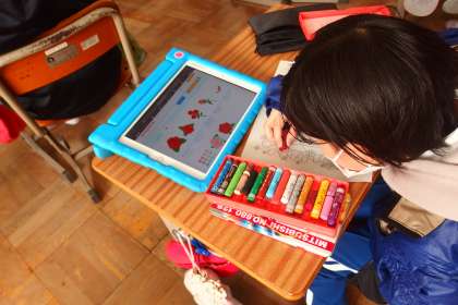 タブレットで検索した結果を参考にしながら描画をする4年生です。