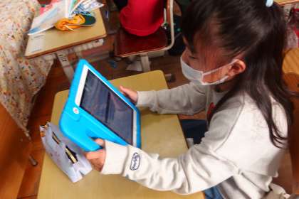 タブレットに健康観察を入力している1年生です。