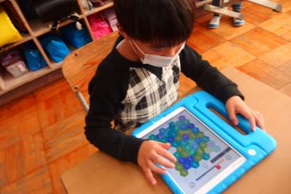 タブレットのアプリを使って算数の計算練習をする1年生です。