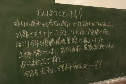 11月24日の東広瀬小学校(14) 公開日 2022/11/24 更新日 2022/11/24 活動の様子 6年生の教室の黒板には、昨晩のサッカーワールドカップカタール大会での日本の歴史的大勝利のコメントが書かれていました。 日本チームのみなさん、おめでとうございます。 悲願のベスト8進出目指して、頑張ってください。 グランパスの相馬選手の活躍も楽しみにしています。