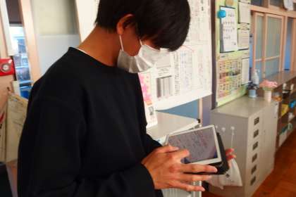 教職員同士の連絡をタブレットで確認している担任の先生です。