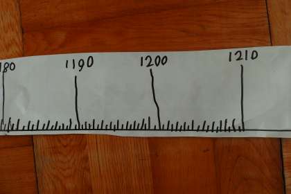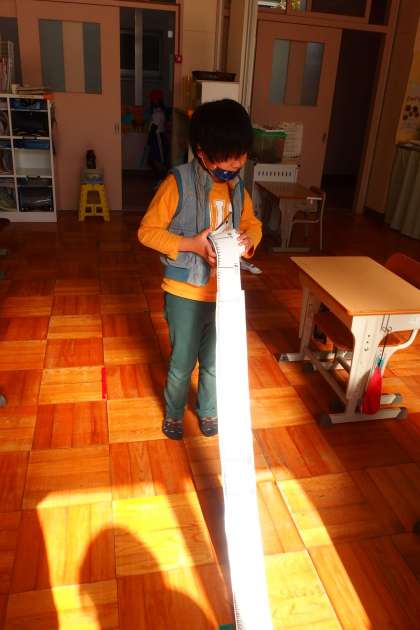 2組の算数の授業です。 1000センチメートル(10メートル)のメジャーが完成しました。