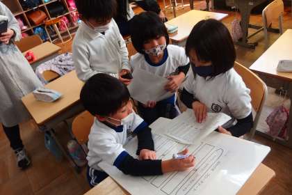 2年生の生活科の授業で、プログラミング的思考のベースとなるフローチャートを学習しました。