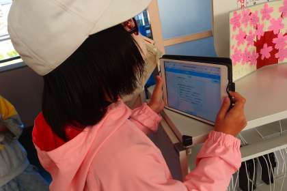 タブレットに健康観察を入力する6年生です。