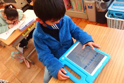 タブレットに健康観察を入力する1年生です。