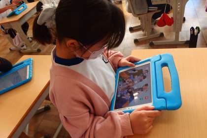 わかばタイムの様子です。 タブレットのアプリで復習をしています。