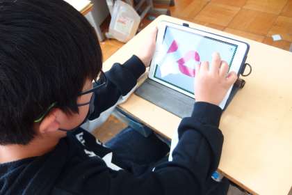 タブレットでタングラムに取り組む5年生です。 全校的にタングラムが流行しています。