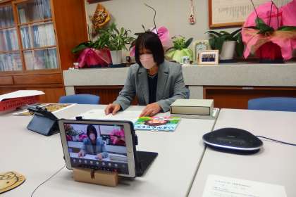 タブレットのアプリのチームスを使って、校長室から各教室にリモートで配信しました。