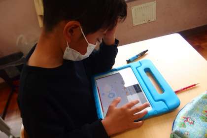 デジタルドリル(Qubena)で国語の復習をしている4年生です。