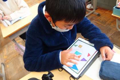 タブレットのリスーピアのアプリでタングラムに取り組んでいる5年生です。