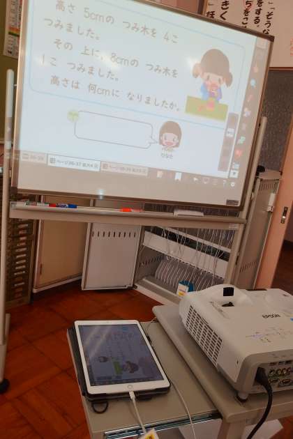 先生のタブレットのデジタル教科書をスクリーンに映して授業を進めていました。