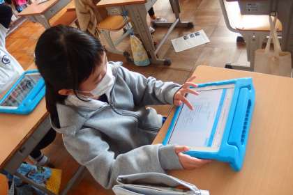 タブレットに健康観察を入力しているところです。