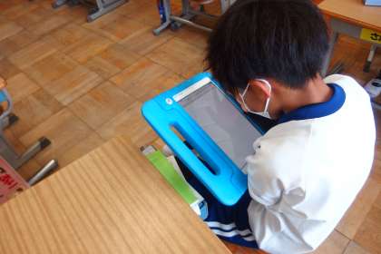 タブレットに健康観察を入力しているところです。