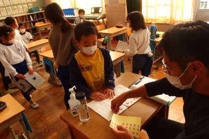 担任の先生に連絡帳をチェックしてもらっている3年生です。