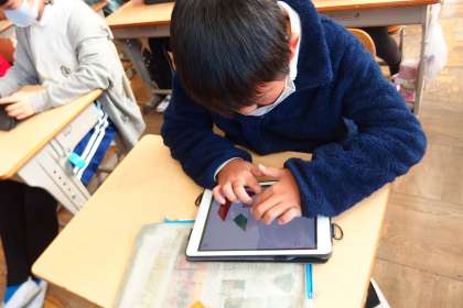 わかばタイムにタブレットでタングラムに挑戦中の5年生です。