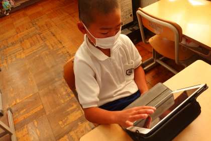 わかばタイムにタブレットでタングラムに挑戦中の5年生です。