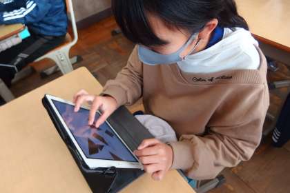 わかばタイムにタブレットでタングラムに挑戦中の5年生です。