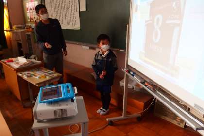タブレットを自分で操作して画像を見せながらスピーチをしていました。