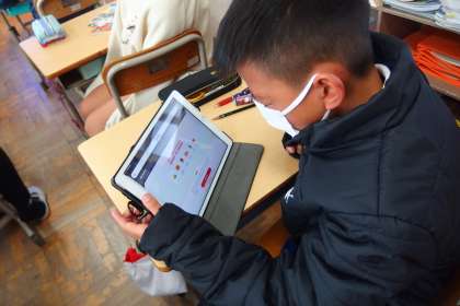 飲食店で英語で注文をする場面の練習をするために、タブレットを使ってインターネットで検索して、アメリカの飲食店の本物のメニューで興味、関心を爆上げしている5年生です。