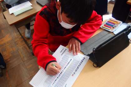 走れ走れで走った距離をカードに記入している5年生です。