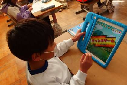 タブレットで復習をする4年生です。