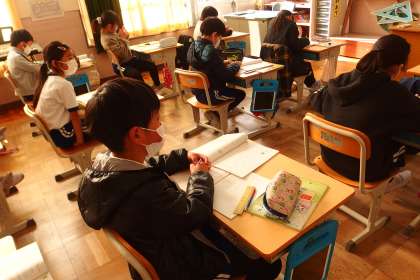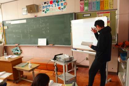 担任の先生がタブレットから問題をスクリーンに映し出して、全員で解き方を確認していました。