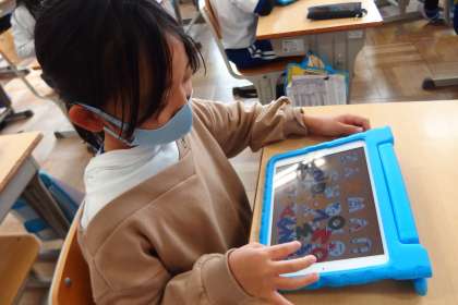 12月14日の東広瀬小学校(33) 公開日 2022/12/14 更新日 2022/12/14 活動の様子 2年生の外国語活動の授業です。 タブレットのアプリ「ABCパズル」に取り組んでいる2年生です。