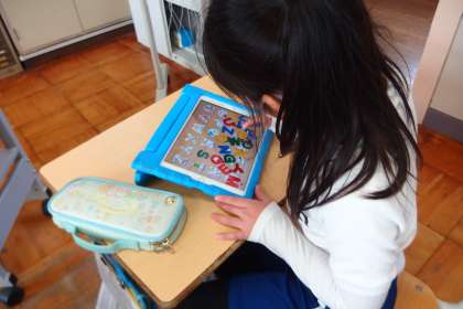 タブレットのアプリ「ABCパズル」に取り組んでいる2年生です。