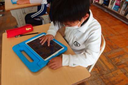 タブレットのアプリ「ABCパズル」に取り組んでいる2年生です。